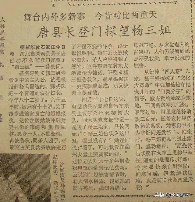 由评剧艺术家新凤霞主演杨三姐,一时间,在全国就成了家喻户晓的故事:“贫农家庭岀身的杨三姐,因其二姐被丈夫高占英杀害,她偕兄鸣冤,历经了千辛万苦,终于让杀人元凶高占英认罪伏法,使杨二姐沉冤得雪……”