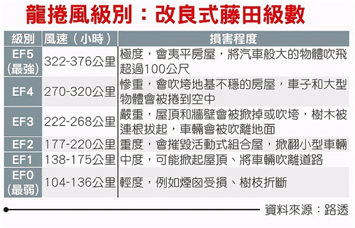 藤田级数划分为F0至F5级,改进型藤田级数划分为EF0到EF5级6个等级。EF0级的龙卷风可能只会损伤树木,对较为结实的建筑没有影响,EF5级的龙卷风能把建筑物美国那些木结构房子吹得只剩下地基,甚至对摩天大楼也极破坏力。