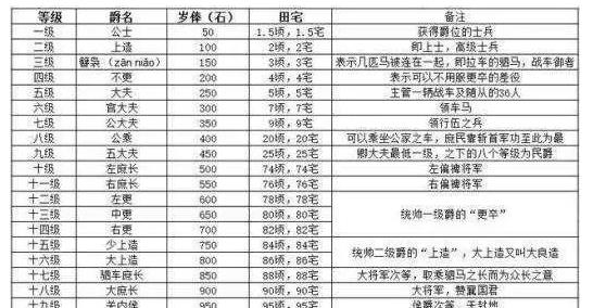 例如只要达到公士这个最低的爵位,便可以每年可领取俸禄五十石,同时享有田1.5顷(150亩)、宅1.5处、仆人一个。而晋升到下一级“上造”,便可以每年领取俸禄一百石,同时享有两宅地、蓄隶两人。簪袅、不更、大夫等爵位如上图所示。