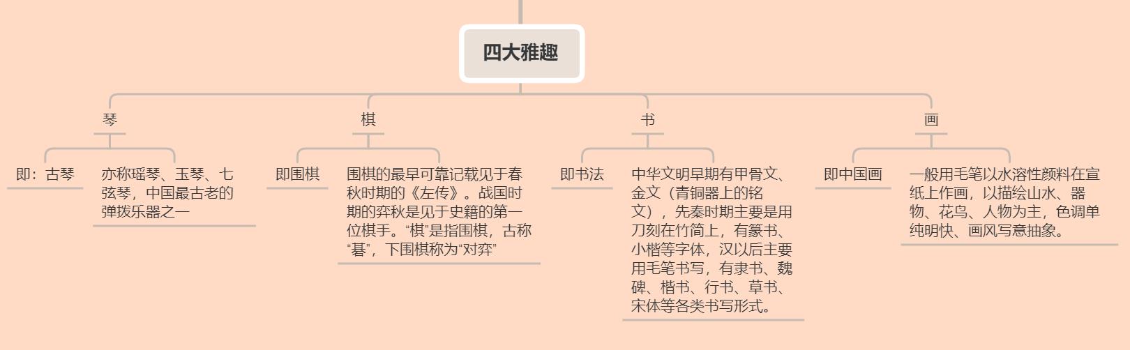 四大雅趣即琴棋书画,在古代,弹琴(多指古琴)、弈棋(多指围棋)、书法、绘画是文人骚客(包括一些名门闺秀)修身所必须掌握的技能,故合称琴棋书画。今常以表示个人的文化素养。
