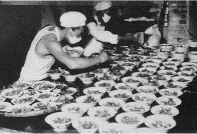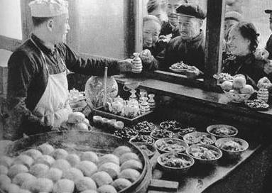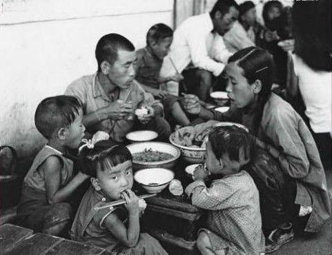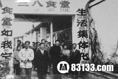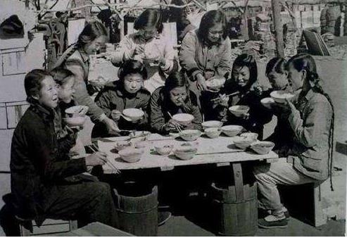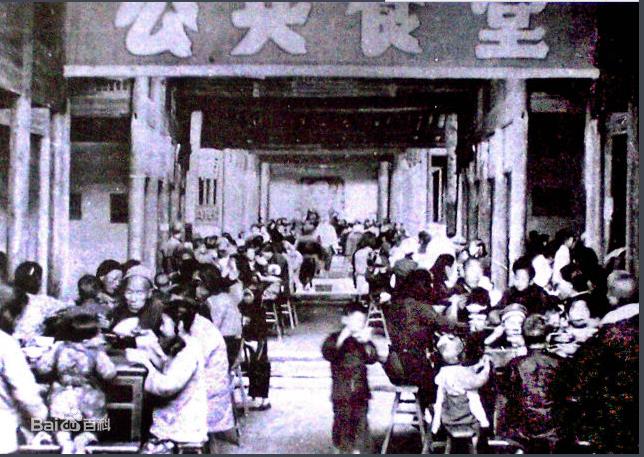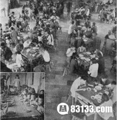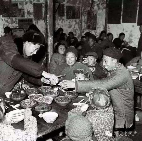 人民公社大食堂是大跃进的产物,当时各村生产队都成立了公共食堂,吃起了“吃饭不花钱”的大锅饭,那景象真是其乐融融,我们现在来看人民公社大食堂,有点类似于现在村里办酒席的场面。