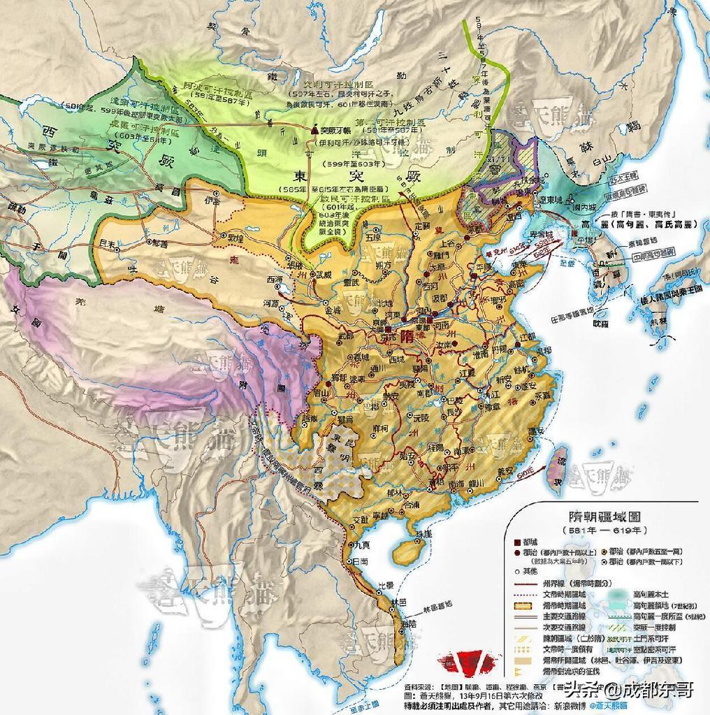 中国起止时间公元581年 ~ 公元619年帝王数2建立者杨坚末帝杨广都城洛阳统治区域480万平方公里主要宗教佛教,道教常用语言切韵政体三省六部制所属洲亚洲主要城市太原、梁郡、江都、余杭、涿郡等国家领袖杨坚、杨广、杨侑、杨侗人口数量46,019,956人(609年)主要民族汉族国土面积467万平方公里(公元612年)著名人物杨素,李密等货 币圆孔钱人口数量约5032万(公元609年)选官制度科举制