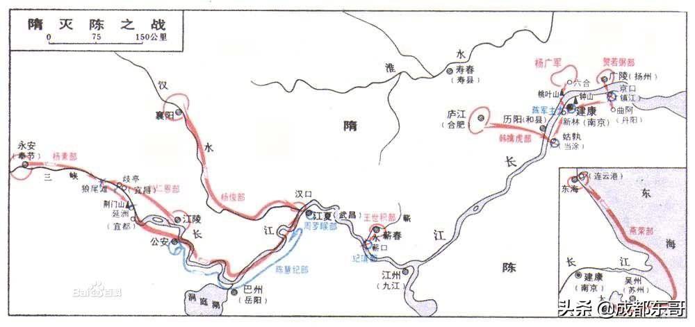 杨素率水军从巴东顺长江东下,与荆州刘仁恩军联合占领延州(今长江西陵峡口、湖北枝江附近)等上游陈军防御。由公安东援建康之中游陈军也被杨俊军阻于汉口一带,为下游隋军创造有利条件。下游隋军主力乘陈朝欢度元会(即春节)之机分路渡江。行军总管韩擒虎、贺若弼两军钳击建康,与宇文述军包围建康。