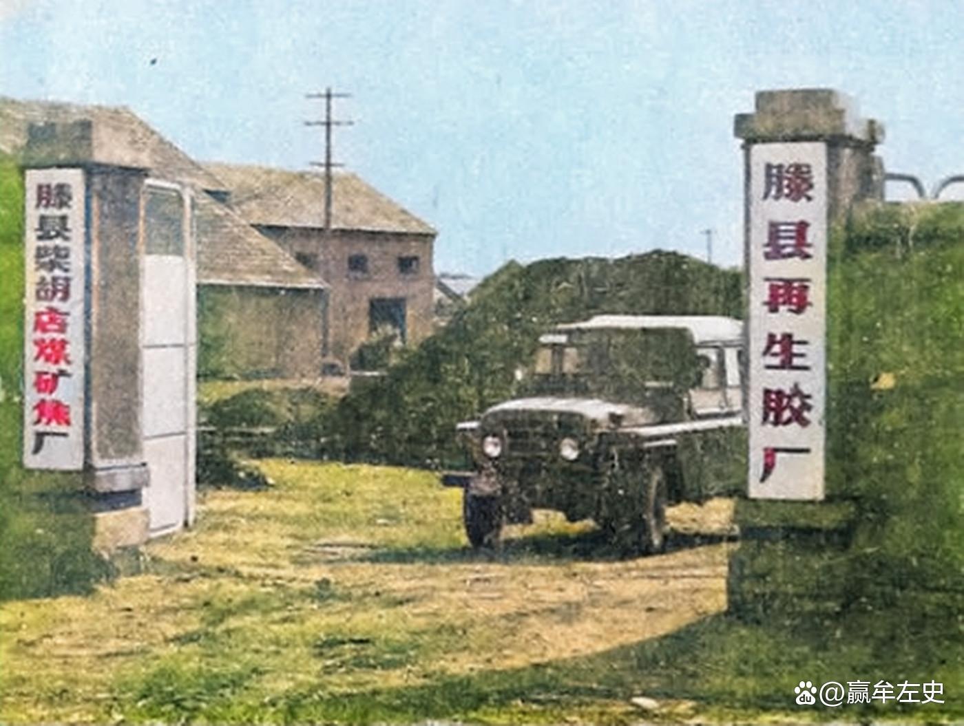 80年代的滕县再生胶厂,一辆解放大卡车正从大门内向外驶出。
