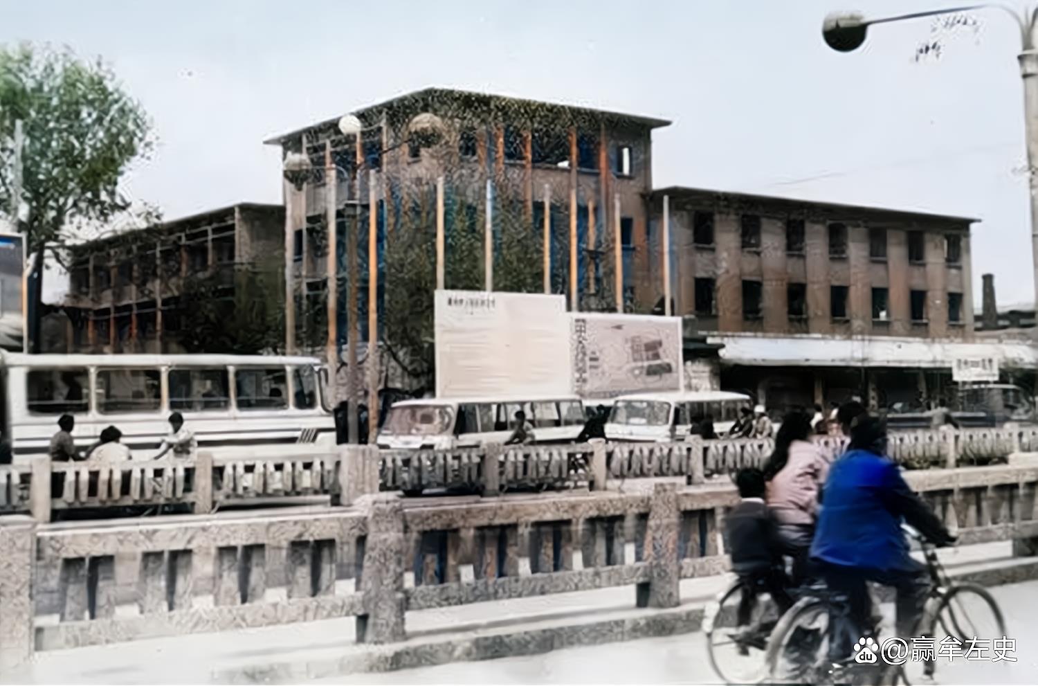 80年代的荆河路立交桥,桥上行驶着公交车和骑自行车的行人。