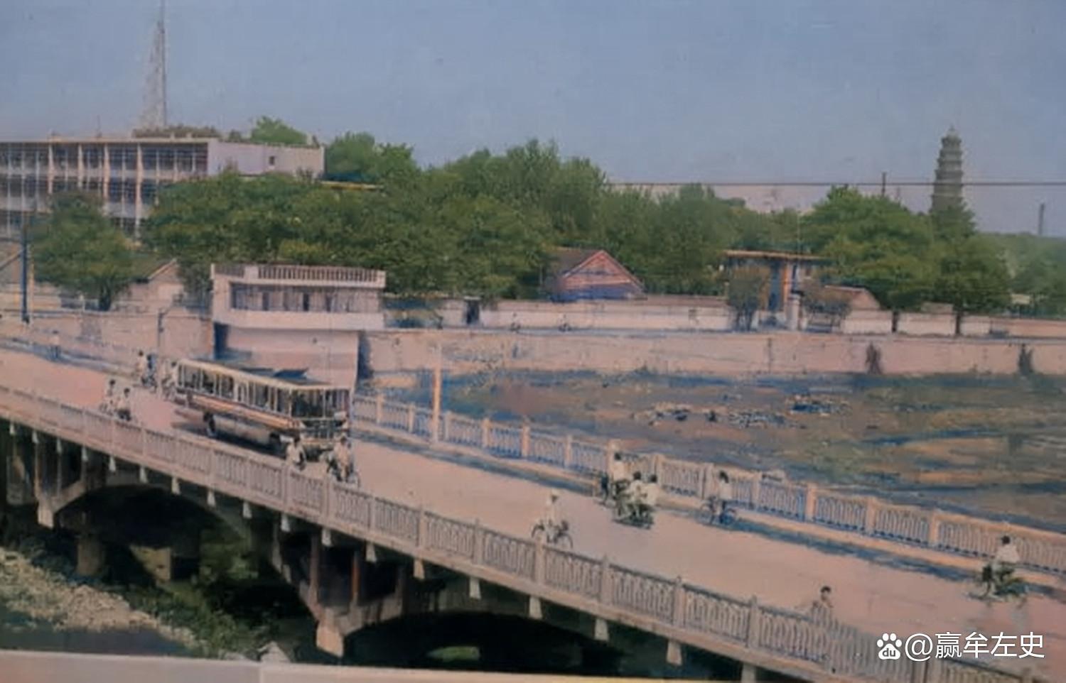 80年代末的荆河桥,可见远处的龙泉塔。荆河是滕州的母亲河,穿滕州城流向西南最终流入微山湖。荆河西岸高耸着龙泉塔,每当斜阳西照,霞光万道,波水涟漪与塔影远山相映生辉,极为奇丽壮观,被古人命名为“塔影高标”,又称“浮屠峙玉”,为古滕八景之一。 龙泉塔建于唐朝,矗立在滕州荆河西岸,是滕州一座永远不倒的地标。