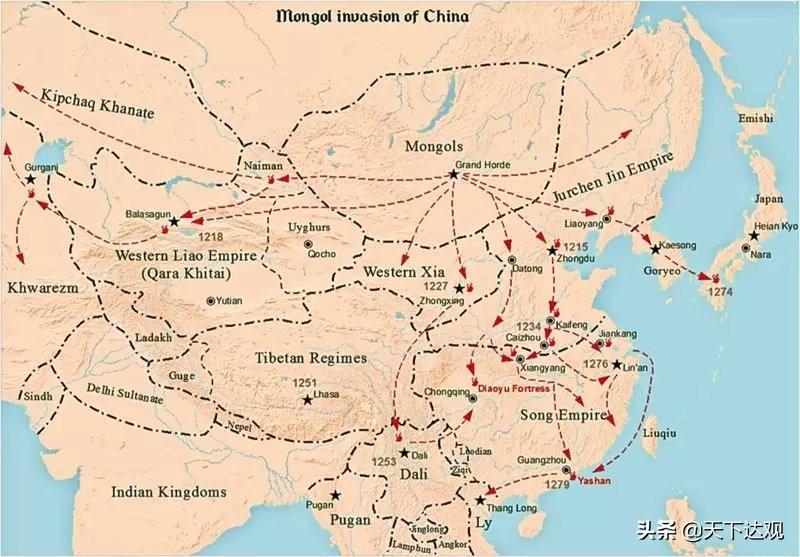 大蒙古国建立后屡次对外征服,成吉思汗在位时开始征伐西夏、西辽、金国、花剌子模等国,