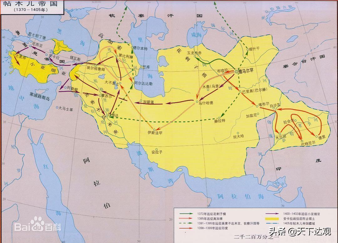 1404年帖木儿率领20万军队进攻中国明朝,结果在1405年进军途中病死。
