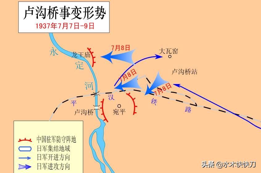 1937年7月8日凌晨,日军进攻卢沟桥和宛平城,遭中国守军坚决反击。此后日军以协商解决为缓兵之计,暂缓攻击,7月11日后战事再次因日军炮轰升级。