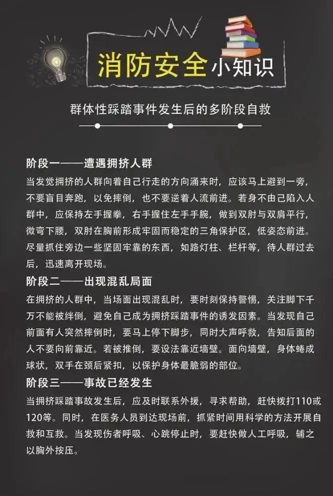 以上这些惨痛教训告诉我们,为了生命安全千万不要去空间狭小而人流密集的地方,即便身处此地也要记好紧急出口的位置。如果被巨大人流裹挟无法控制前进方向,尽量胳膊护在胸前向侧前方移动,保证自己的呼吸。此外如果不慎倒地又无法站立,尽量蜷缩起来抱住头部。在大型灾难事故面前,人类的力量过于渺小。我们能做的就是尽量不凑热闹或在人群外围活动,重要的事情说三遍,为了生命安全千万不要去空间狭小而人流密集的地方!