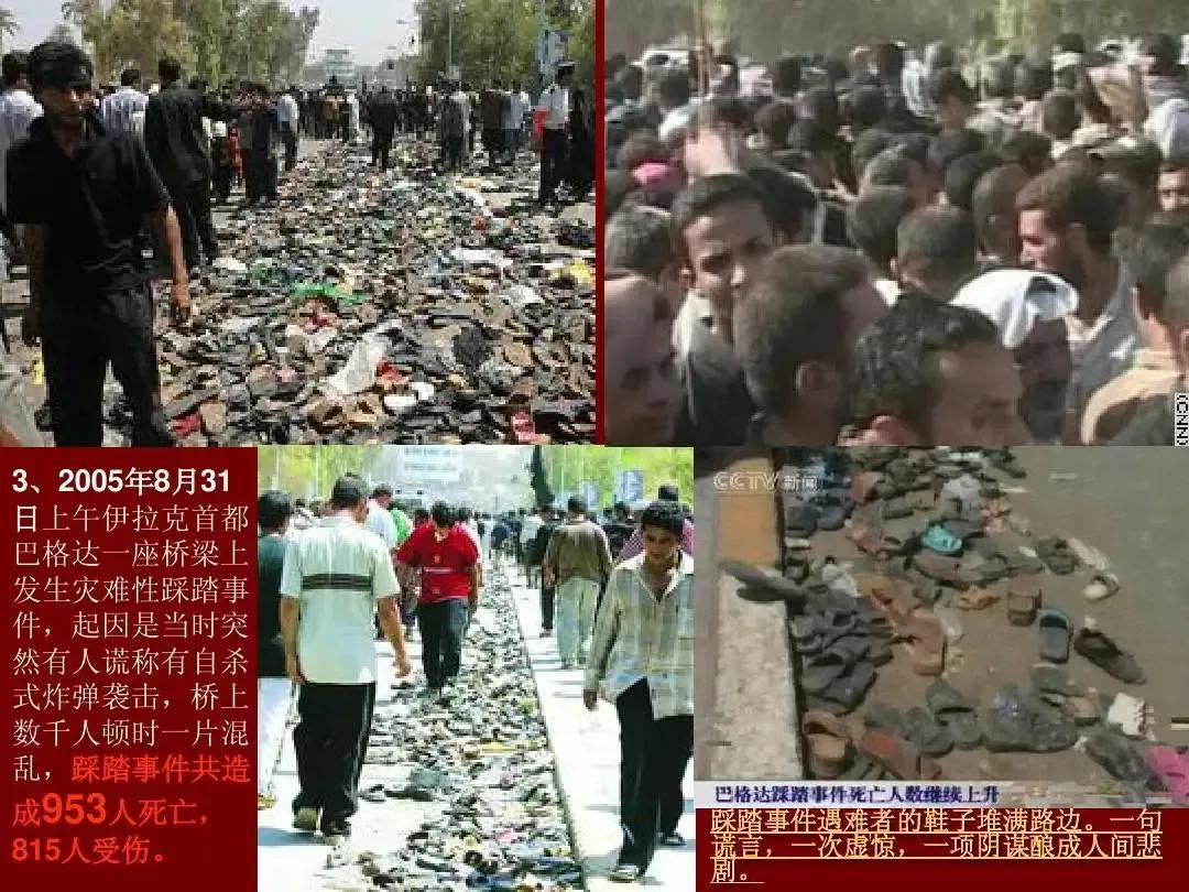 除此之外2005年伊拉克巴格达的踩踏事件也造成上千人伤亡。2005年8月31日上午,来自巴格达及外省的约100万名穆斯林聚集在巴格达的伊玛目卡齐姆清真寺附近,参加例行的纪念活动。事发时,有的人从清真寺返回,有的人赶往清真寺,两股人流在位于巴格达北部阿扎米亚区的一座桥上相遇,桥上顿时拥挤不堪。当时桥上突然有人谎称有自杀式炸弹袭击,桥上的上千人顿时乱作一团,不少人被推倒或者跳下河中。事后统计这次踩踏事件造成953人死亡,815人受伤,其中大多数是老弱妇孺。