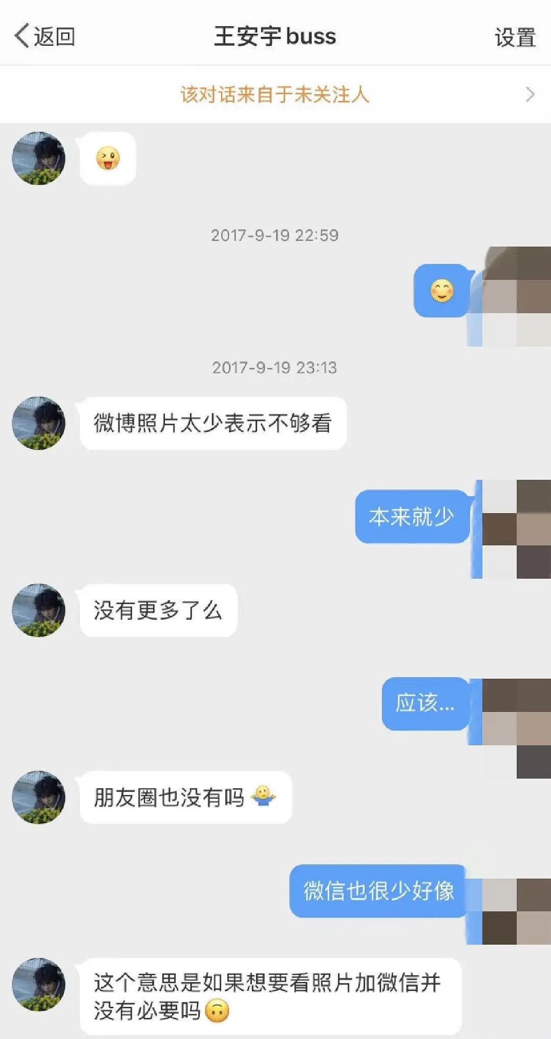 从该网红晒出的证据来看,王安宇曾私聊自己表示微博照片太少不够看,还暗示想看女网红的朋友圈,言语十分大胆热情。