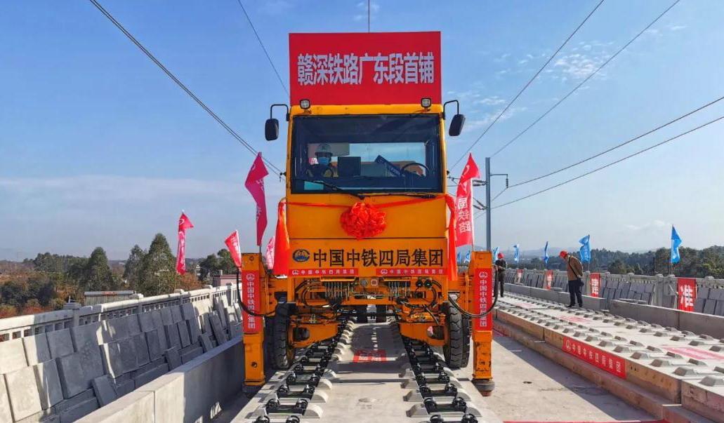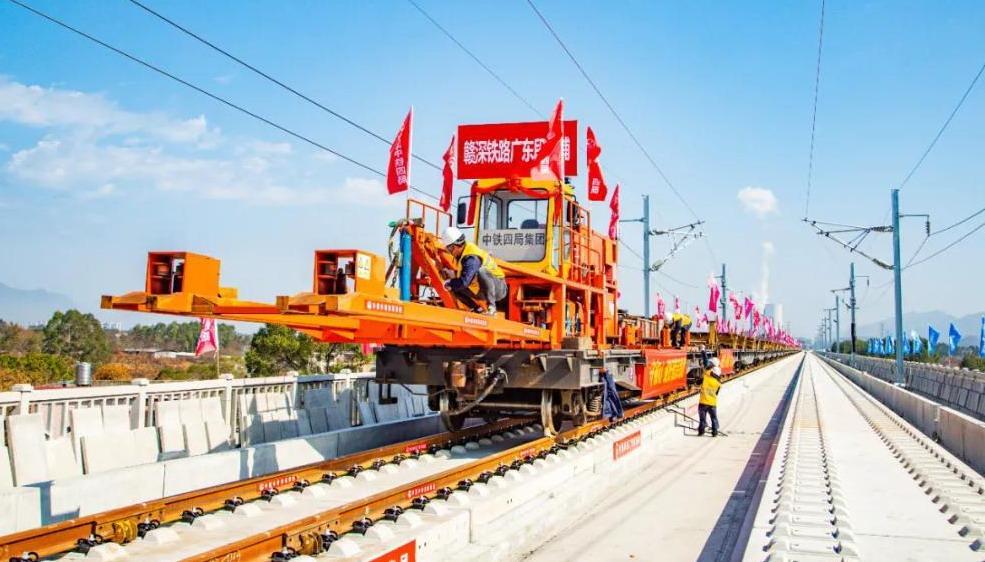 据了解,赣深高铁是京九客运专线的最南段部分,是我国“八纵八横”高速铁路网的重要组成部分,线路贯穿江西、广东两省的赣州、河源、惠州、东莞、深圳五市,全长432公里。其中,广东段全长297.03公里,设计最高时速为350公里。据中铁四局赣深铁路5标工程指挥部有关负责人介绍,中铁四局承担赣深高铁广东段双线共计704.9公里铺轨任务,其中无砟轨道铺设604.5公里,有砟轨道铺设100.4公里。按照总工期的要求,工程队每天铺轨进度在6公里左右,预计5月底可完成全线700多公里的铺轨任务,为后期联调联试及开通奠定坚实的基础。
