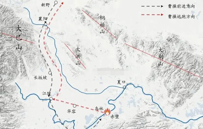 首先,赤壁之战发生在江汉平原上。从地形图可以看得很清楚,江汉平原的西北方向是巴山和秦岭山脉,北部则是绵延千里的大别山山脉。曹操想要北归,就只有延原路返回,先回江陵,再到襄阳,进而向北返回中原。除此之外,别无它途。