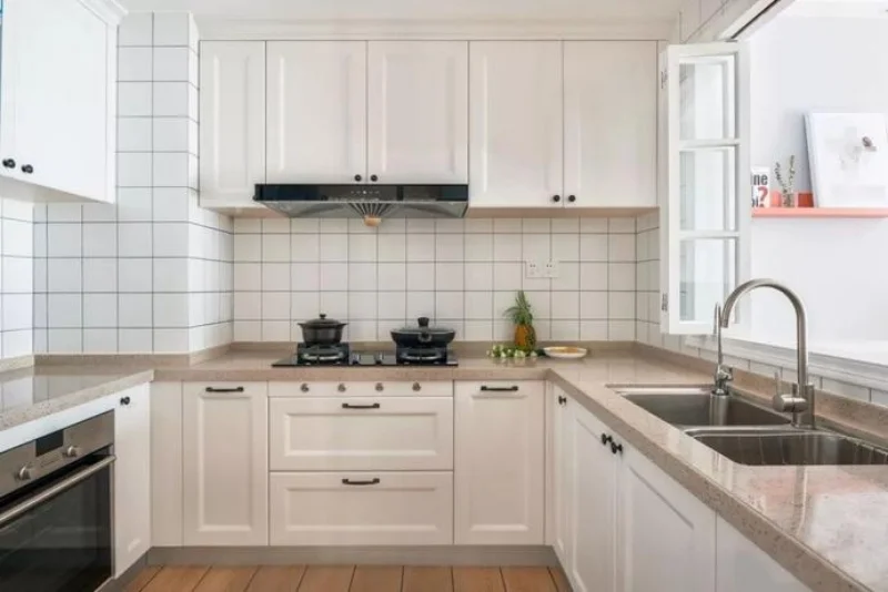 U型橱柜设计,满足日常功能的需求和操作,白色和原木色的搭配,让房屋整体风格更统一。
