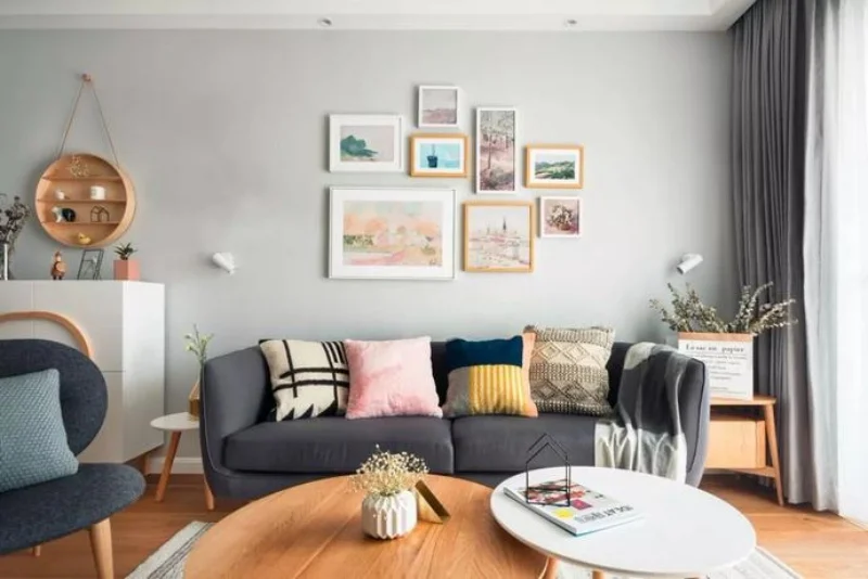 客厅以白色和原木色为主基调,点缀上深浅的灰色,让空间更显舒适温馨。