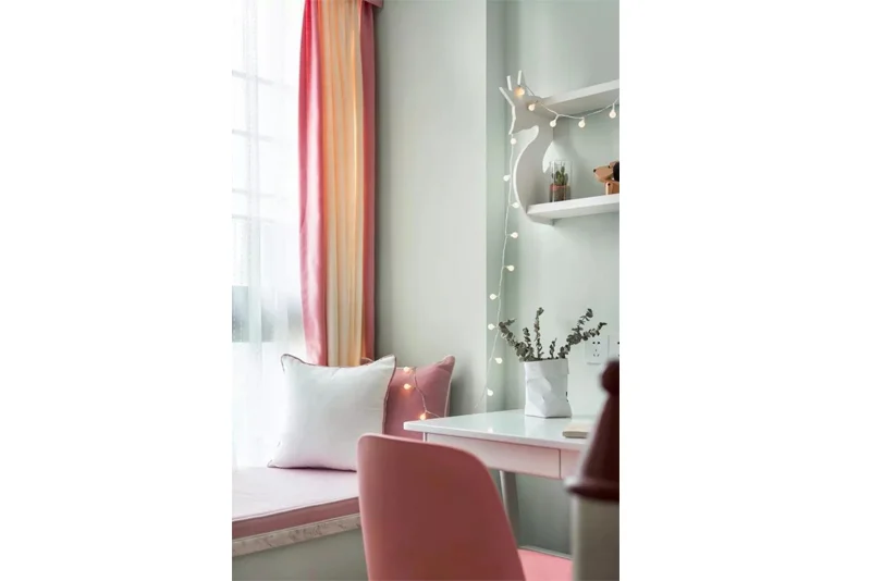 儿童房搭配上飘窗的粉色窗帘,使得整个空间更活跃。