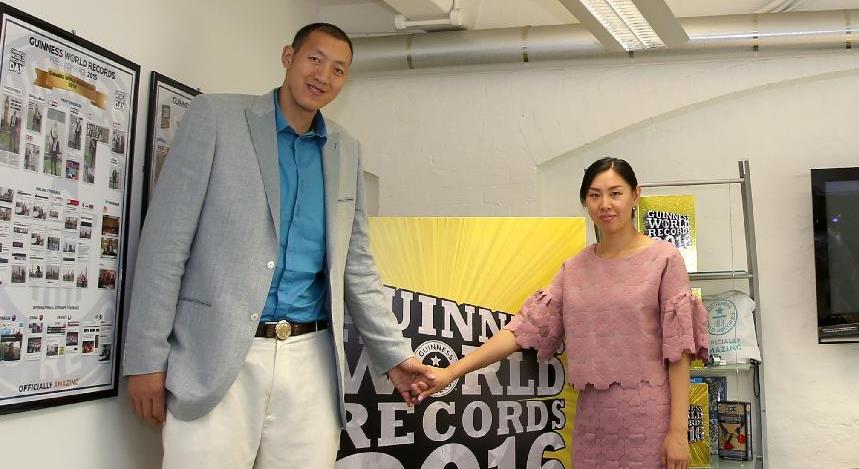 图为2015年9月,“世界最高夫妻”纪录保持者,我国前篮球运动员孙明明与妻子造访吉尼斯伦敦总部的照片。他们身处的这个空间就是吉尼斯总部的办公室啦!