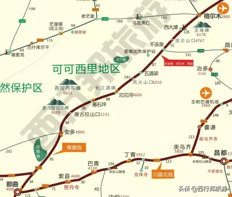 加油站:安多、沱沱河、纳赤台、西大滩、沱沱河等地可加油。