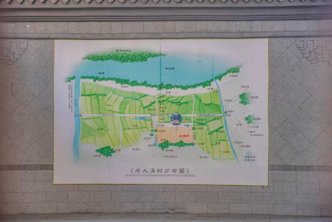 在郑氏宗祠后面的文化长廊里面,贴着一张“老大涌村分布图”,上面清楚的记录着旧改前的地域分布,村周边都是由一大片一大片稻田围绕。