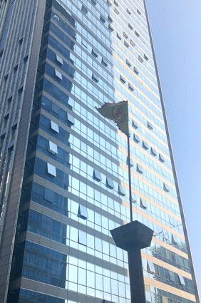 门口飘扬着的“郑氏”旗,与背景里的高楼,显然很不协调。