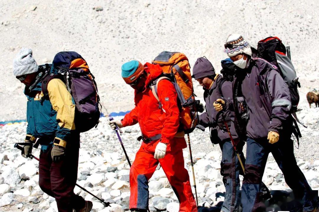 2005年4月18日,承当珠峰复测登高丈量队员从海拔5200米的大原营前去更高的营地。新华社发