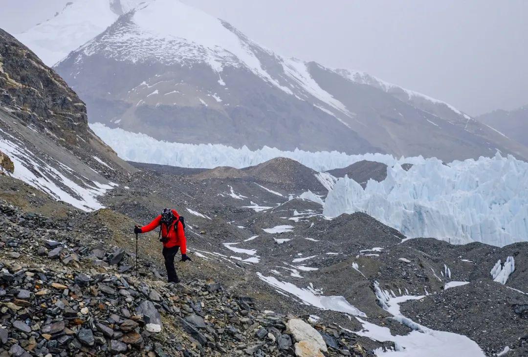 攀爬队员沿绒布冰川徒步前去珠峰进步营地的路上。图据北京大学2018珠峰爬山队