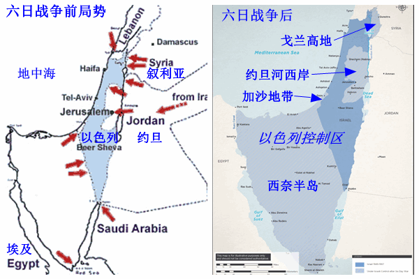 第三次中东战斗,可谓战斗史上的典范战争。在这场战斗中,以色列吞噬了加沙地戴、约旦河西岸、耶路撒冷旧城、埃及的西奈半岛和叙利亚的戈兰高地,总计6.5万平方公里的阿拉伯地盘,版图比战前大了3倍,从而决定了以色列在战术上的上风。埃及、约旦、叙利亚三个阿拉伯国度蒙受严沉损坏,伤亡和被俘达6万余人,而以色列仅牺牲983人。