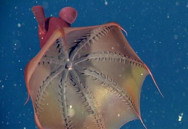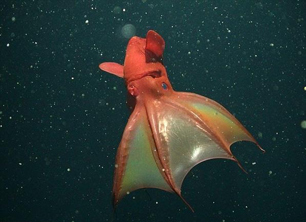 这种独特的深海头足动物有暗红色的身体(约一颗足球般大小),大大的蓝眼睛和由八只刚触手延伸出来、组成一个像斗篷般的大网。