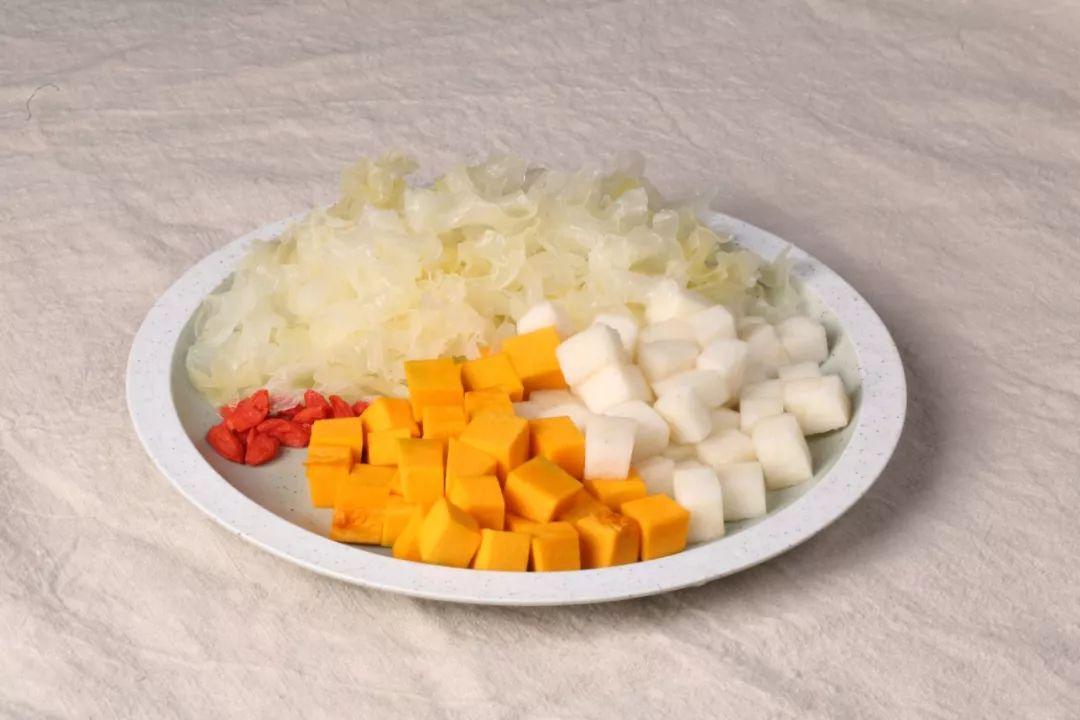 ①银耳提前泡发备用,南瓜、雪梨洗净去皮,切成 2 厘米见方的小块,泡发的银耳也撕成同样大小的小块。