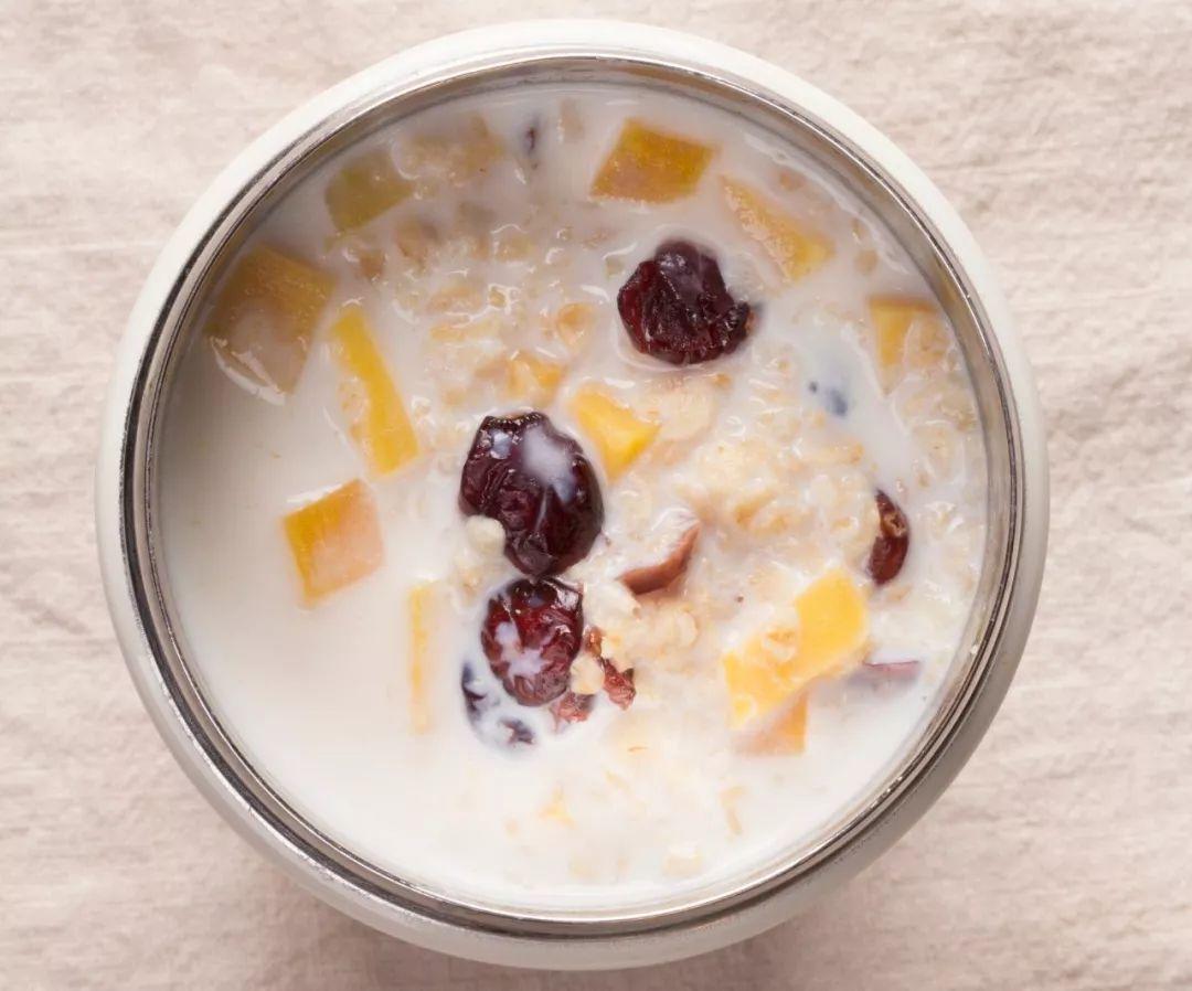 ②加入燕麦片和蔓越莓干,继续煮 3 分钟。把粥倒入焖烧杯,焖 30 分钟即可。