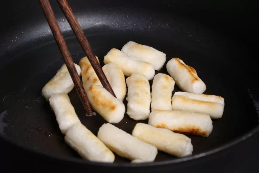 ①将韩式年糕在 80℃ 的热水里浸泡 10 分钟,然后捞出沥干备用。