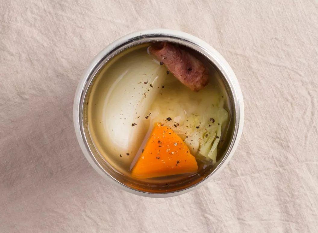 ④加入培根和圆白菜,继续焖 10 分钟,其间可视情况加水。最后加入盐,将食材倒进焖烧杯焖 1 个小时即可。