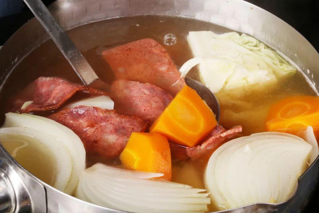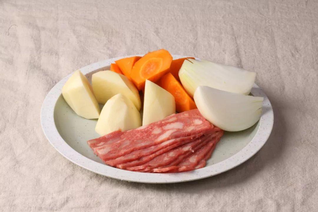 ①马铃薯、圆白菜、胡萝卜、洋葱洗净,其中马铃薯和胡萝卜去皮。将蔬菜切成 3 厘米见方的小块,培根切成宽约 5 厘米的长段。