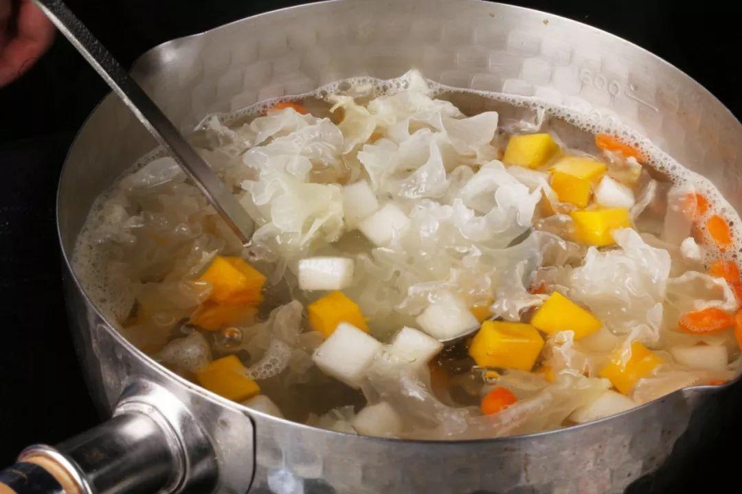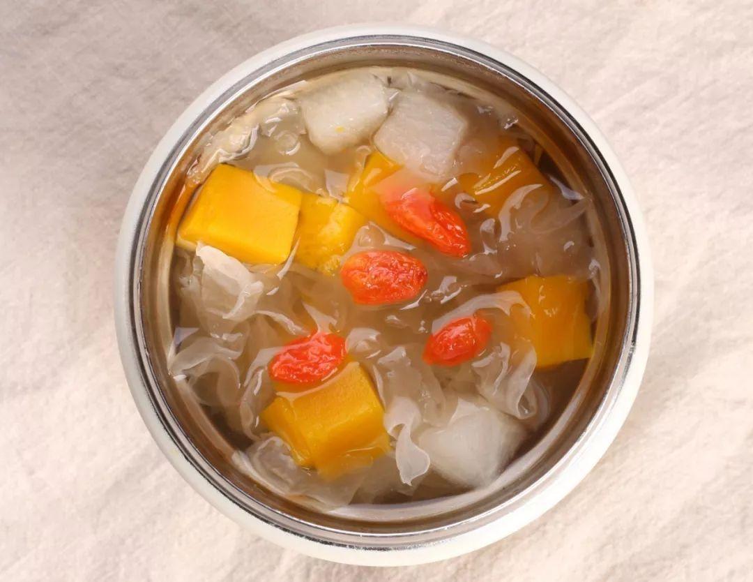 ②将南瓜、雪梨、银耳、枸杞下入锅中,煮至沸腾后转中火,加入冰糖,继续煮 1 分钟,盛出倒入焖烧杯里,焖 1 个小时即可。