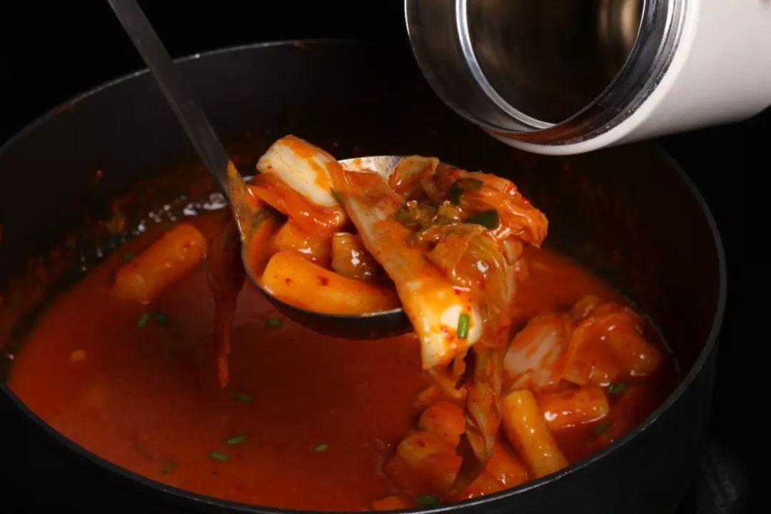 ③向锅中加水至没过年糕,放入韩式辣酱和韩式辣白菜,煮 5~6 分钟至汤汁浓稠。