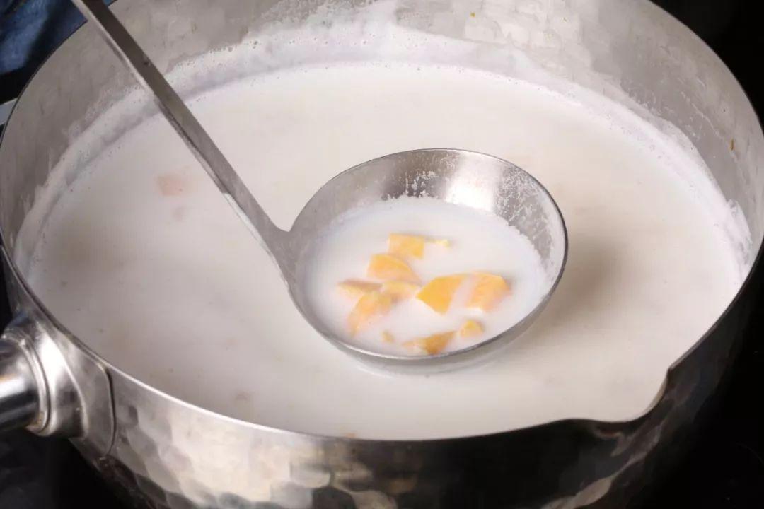 ①将红薯切成 2 厘米见方的小块,然后和牛奶一起倒入锅中,煮至红薯断生。