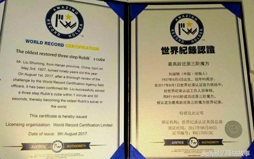 位于厦门的世界纪录认证公司的认证公司中国分部给予了大力支持,帮老人设计了挑战现场的背景图片。年龄、速度、挑战环境,就完全达到了认证机构的挑战条件。8月9日,顺利通过世界纪录认证公司复审,并发出了认证证书,刘淑明老人终于获得了“最高龄还原三阶魔方世界纪录”称号。