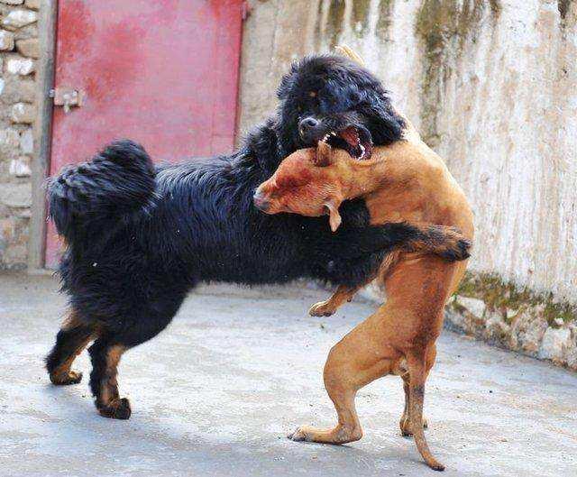如果不是狗主人拉开制止,藏獒就要被比特犬活活咬死了。比特犬是美国培育出来的品种,一只身高45厘米,体重30公斤左右的比特犬能把一只身高95厘米,体重100公斤左右的高加索犬在几分钟内咬倒在地,包括体重90公斤以上的日本杀手土佐犬也不是比特犬的对手。由此可见,比特犬是世界上最凶猛的狗的称号也不是白叫的。