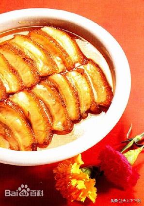 绉纱甜肉是潮汕地区喜庆筵席必备之品。将五花肉煮熟,皮上扎小孔,涂酱油上色,然后入锅油炸至表皮收缩,取出,用冷水冲漂,去油腻,放入有竹箪垫底的砂锅中,加水和糖焖,再加甜芋泥蒸,勾芡。肉软烂甘香,是荤料制作的一个典型菜例。