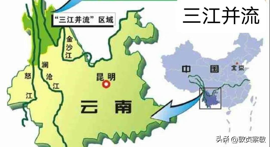 另外澜沧江与金沙江、怒江有一段区域称为三江并流。这是因为这三条发源于青藏高原的大江,在云南省境内自北向南并行奔流了170多千米,所以我们把这一区域称呼为三江并流。