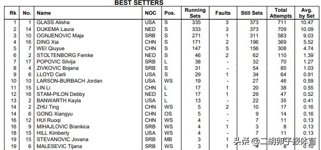 美国二传格拉斯局均10.47个好传球排名第一,荷兰二传蒂耶科马10.09,塞尔维亚二传奥杰年诺维奇9.03,丁霞5.52,魏秋月4.74。
