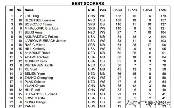 朱婷拿下179分(158个进攻15个拦网6个发球)排名第一,荷兰接应斯洛特耶斯拿下157分,塞尔维亚接应博斯科维奇拿下137分,塞尔维亚主攻米哈伊洛维奇121分,荷兰主攻布伊吉斯104分,美国副攻阿金拉德沃104分,美国主攻拉尔森103分,塞尔维亚副攻拉希奇96分,美国主攻希尔95分,荷兰副攻得克鲁伊夫91分。