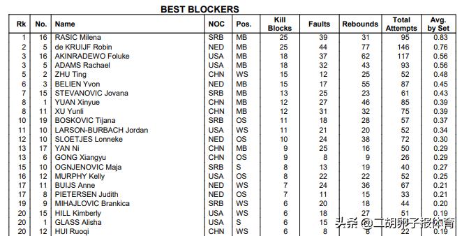 塞尔维亚拉希奇0.83排第一,荷兰得克鲁伊夫0.76,美国阿金拉德沃0.56,美国亚当斯0.56,朱婷0.48,荷兰贝利恩0.45,塞尔维亚斯特瓦诺塞维奇0.43,袁心玥和徐云丽0.39。