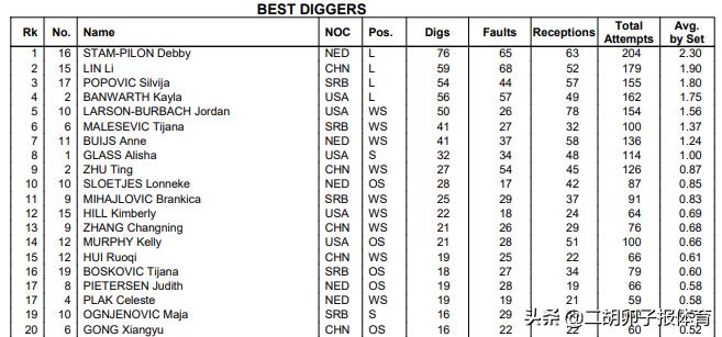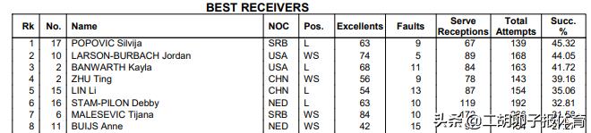 塞尔维亚自由人波波维奇45.32%的成功率第一,美国主攻拉尔森44.05%,美国自由人BANWARTH41.72%,朱婷29.16%,林莉35.06%。
