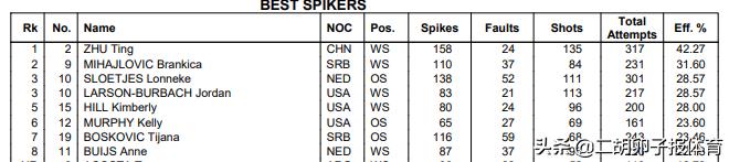 朱婷42.27%的扣球效率拿下第一,塞尔维亚米哈伊洛维奇31.6%,荷兰斯洛特耶斯28.57%,美国拉尔森28.57%。