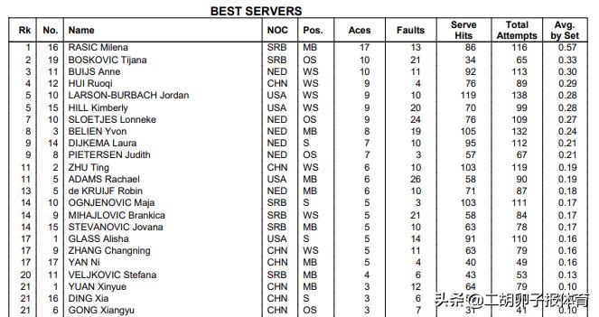 塞尔维亚拉希奇局均0.57个发球得分排名第一,塞尔维亚博斯科维奇0.33,荷兰布伊吉斯0.3,惠若琪0.29,美国拉尔森和希尔0.28,朱婷0.19,张常宁和颜妮0.16。