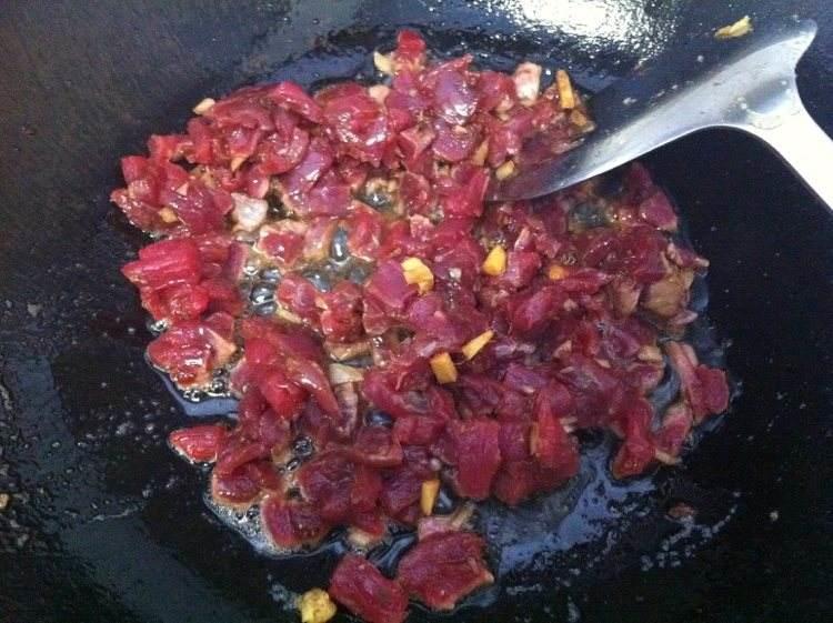 5.锅内放油,开大火烧热,有点儿冒烟儿时,改小火,同时放入处理好的牛肉,肉放入锅中不要急着翻炒,只把肉铲开,小火,约半分钟到一分钟左右,改中大火,开始翻炒,这样一来肉不会粘锅,而且还不出汤。