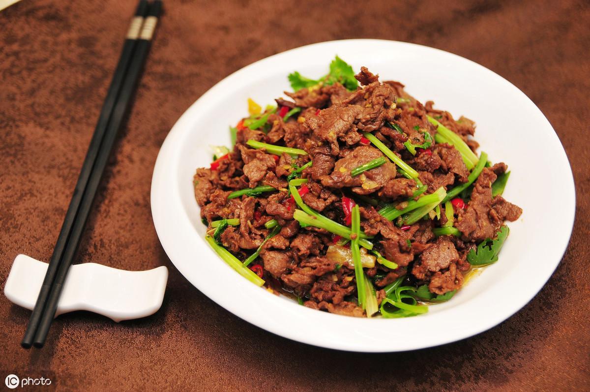 做法:1.西芹洗净切碎,牛里脊切丝,记得要横切,这个就是所谓的横切牛肉了。这个切法的好处就是可以切断牛肉比较粗的纤维组织,使牛肉不会有咬不断的感觉,同时更能入味。切完后,攥一下水分。