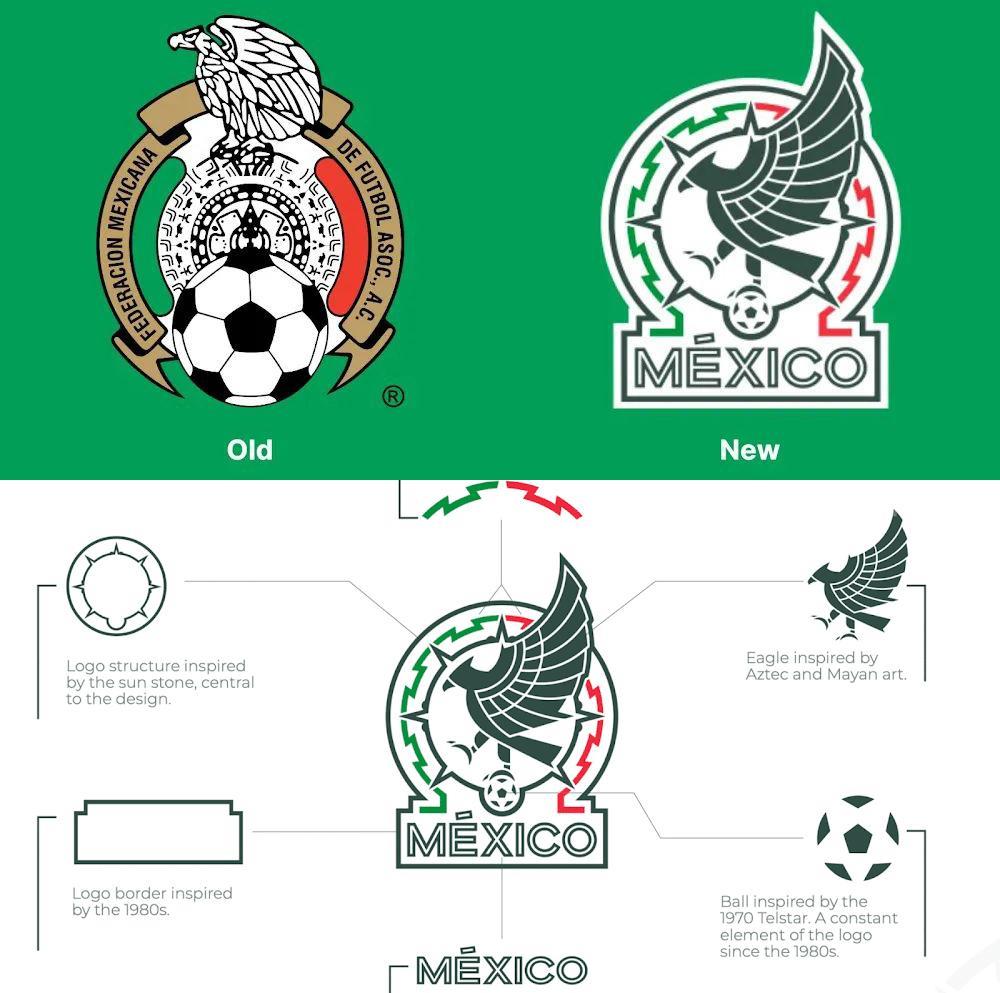 墨西哥国家队 LOGO于2021年末进行了升级,变化不大,只是在一些细节上做了一些调整,让它看起来更有层次感。它在保持原有 LOGO的主要要素的基础上,融入了阿兹台克玛雅文化中的太阳石元素,让它看起来更加气派,更加引人注目。采用墨西哥国旗的灰、绿、红三种颜色,并将1960-1980年代的文字风格相结合。墨西哥的队服是阿迪达斯公司设计的,而主场的绿色球衣则是借鉴了“羽蛇神”这个中美洲的女神,白色的客场球衣上也有一个类似于蛇神的图案。这种艺术象征手法在墨西哥艺术中经常使用。